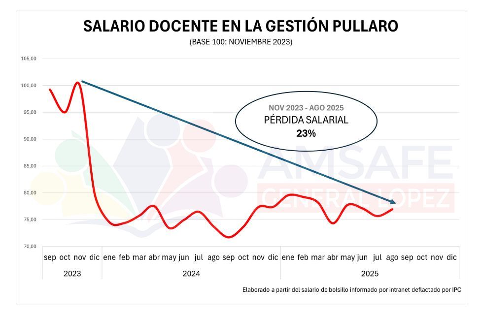 “La devaluación de diciembre de 2023 es claramente el origen de nuestro deterioro salarial. Este impacto fue inmediatamente consolidado por la administración de Pullaro, resultando en una pérdida real del 23% en nuestros ingresos”, dijo la máxima autoridad de AMSAFE Gral. López, Silvia Buzzi.