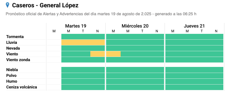 El alerta amarillo por lluvia se encuentra vigente para toda la jornada de este martes 19 de agosto. “El área será afectada por lluvias de intensidad moderada a localmente fuerte, con valores de precipitación acumulada entre 50 y 70 mm, pudiendo ser superados en forma puntual. No se descarta la probabilidad de algunas tormentas embebidas en estas áreas de precipitación”, informó el SMN.