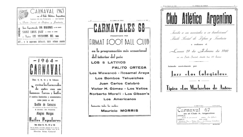 Sobre la segunda mitad de los años 60, grandes artistas pisaron suelo firmatense para brindar sus conciertos en el marco de los carnavales organizados por el Firmat F.B.C. y el Club Atlético Argentino. Gracias al archivo digitalizado de El Correo, que guarda 110 años de historia de Firmat y la región, pudimos rescatar algunos avisos publicitarios de aquella década de oro para los corsos.