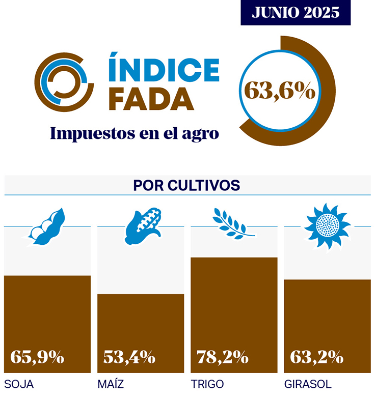 “La medición de junio 2025 marca una participación de los impuestos sobre la renta agrícola del 63,6 % para el promedio ponderado de los cultivos de soja, maíz, trigo y girasol”, es decir que de cada $100 de renta que genera una hectárea agrícola, $63,6 es lo que representan los distintos impuestos nacionales, provinciales y municipales.