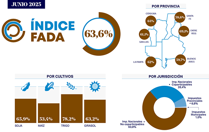 Mientras el Índice FADA nacional es de 63,6%, las provincias muestran diferencias según costos, producción e impuestos locales. Córdoba registra un 64%, Buenos Aires 59,7%, Santa Fe 58,6%, La Pampa 62%, Entre Ríos 69,1% y San Luis: 61,1.